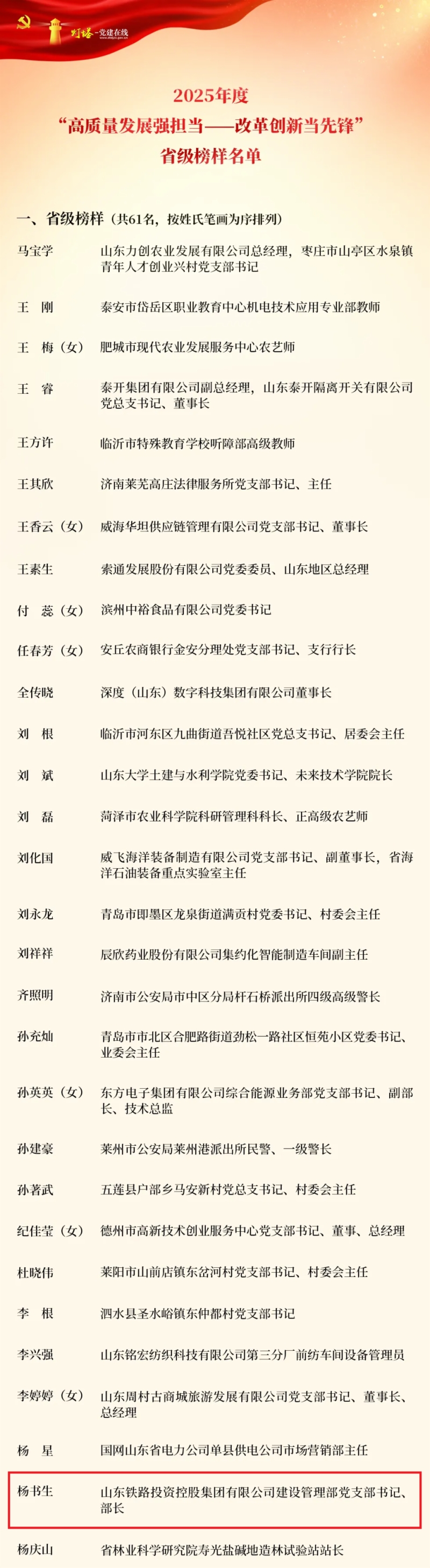7月11日上午,山東省“齊魯先鋒 榜樣有我”榜樣講黨課活動(dòng)在濟(jì)南舉行。現(xiàn)場(chǎng)正式發(fā)布2025年度“高質(zhì)量發(fā)展強(qiáng)擔(dān)當(dāng)——改革創(chuàng)新當(dāng)先鋒”省級(jí)榜樣名單。山東鐵投集團(tuán)建設(shè)管理部部長(zhǎng)楊書生入選。