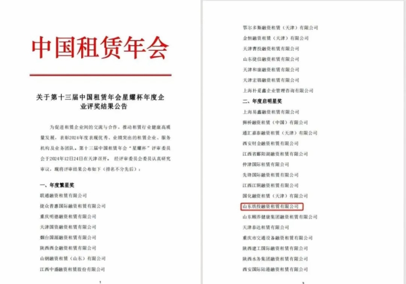 近日,在第十三屆中國(guó)租賃年會(huì)“星耀杯”年度企業(yè)評(píng)選中,山東鐵投集團(tuán)所屬鐵投租賃公司斬獲“年度啟明星”獎(jiǎng),該獎(jiǎng)項(xiàng)旨在突出企業(yè)實(shí)施戰(zhàn)略轉(zhuǎn)型期間,對(duì)行業(yè)具有影響力和貢獻(xiàn)力,能夠樹立良好榜樣的企業(yè)。這也是鐵投租賃公司2024年度繼獲得山東省融資租賃公司“高質(zhì)量發(fā)展獎(jiǎng)”榮譽(yù)稱號(hào)后,獲得的第二項(xiàng)年度榮譽(yù)。